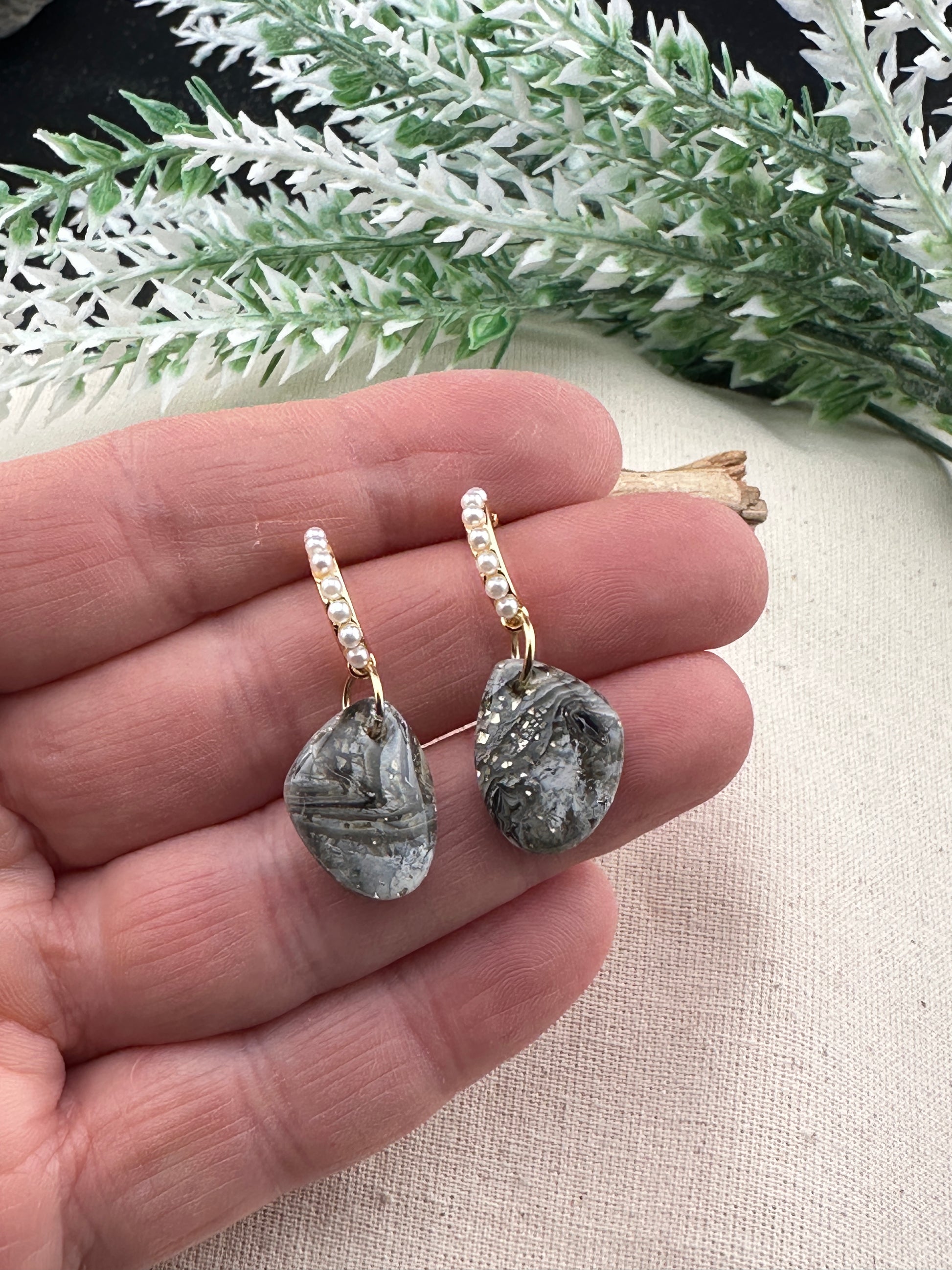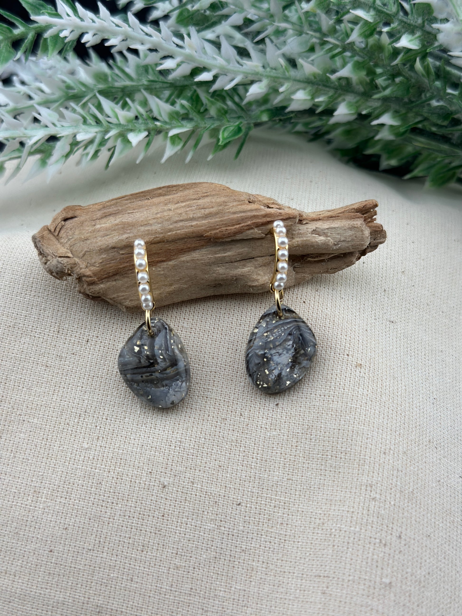 From the Crazy Lace Faux Agate series, these elegant earrings blend earthy richness with celestial shimmer. Featuring hand-marbled faux agate in swirling tones of charcoal and soft black, flecked with gold foil for a touch of magic. A row of dainty pearls adds grace, anchored by a luxe 18K gold-plated sterling silver post. These earrings are lightweight, hypoallergenic, and refined — perfect for adding a polished finish to any outfit.
