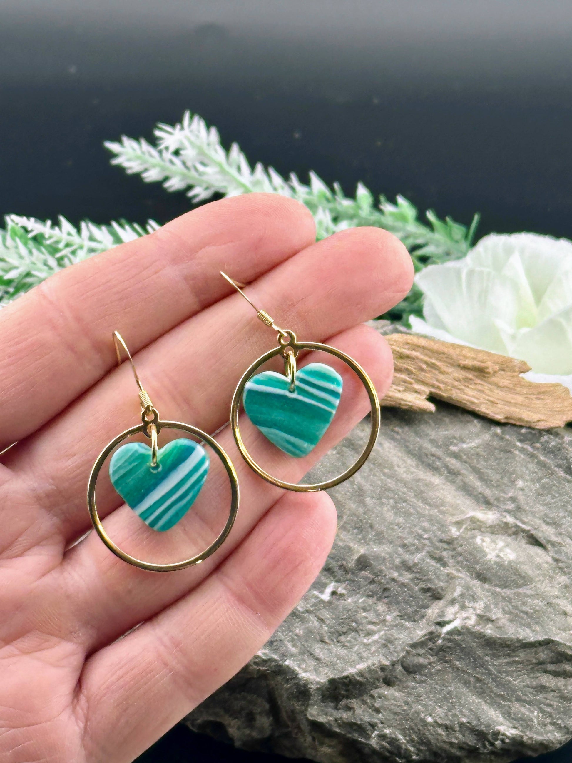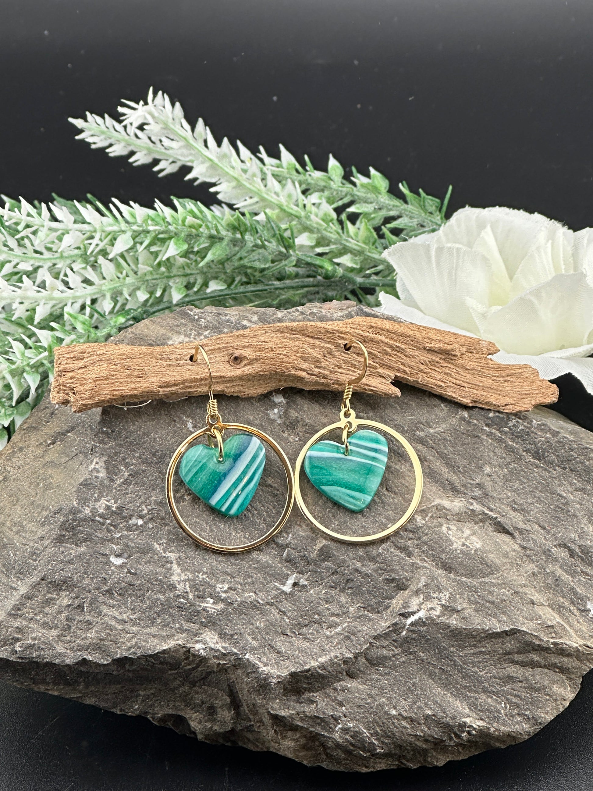Faux Blue Agate Inspired Gold Hoop Heart Earrings